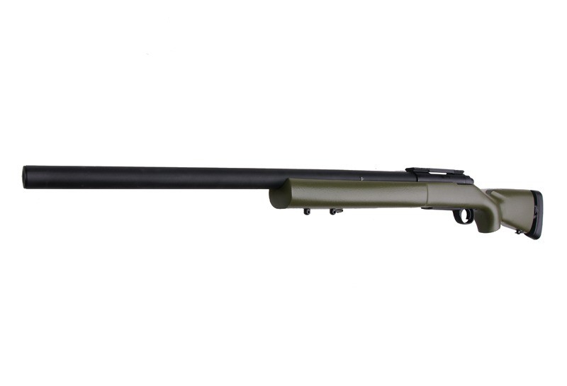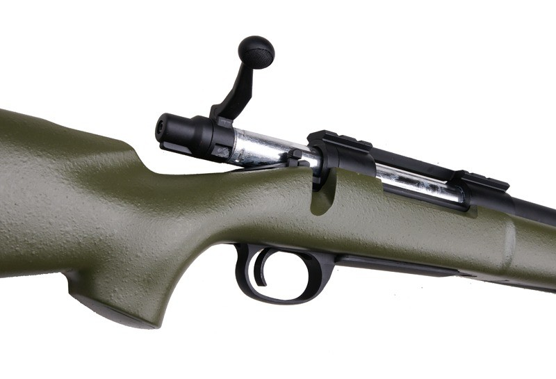 Spring powered airsoft gun. Replica of model M24 SOCOM – Military in olive color by Snow Wolf. It is characterised by an excellent workmanship reciever out of a solid polymer, metal trigger mechanism and a long, lightweight barrel which is externally splined. Rubber buttpad allows length adjustment.The basic model of the weapon is equipped with sling swivels for sling, mounting rail for attaching mounts and adjustable Hop-Up mechanism.