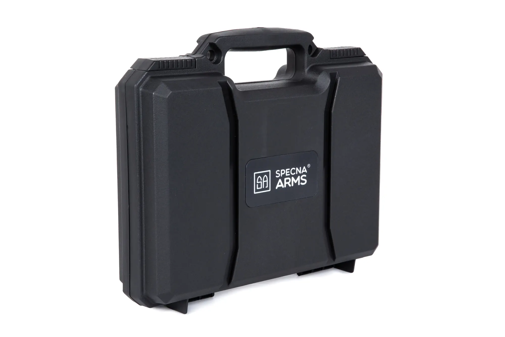 Walizka posiada wygodny chwyt transportowy, zamykana jest na dwa rozsuwane zatrzaski, a front walizki jest ozdobiony logiem marki Specna Arms