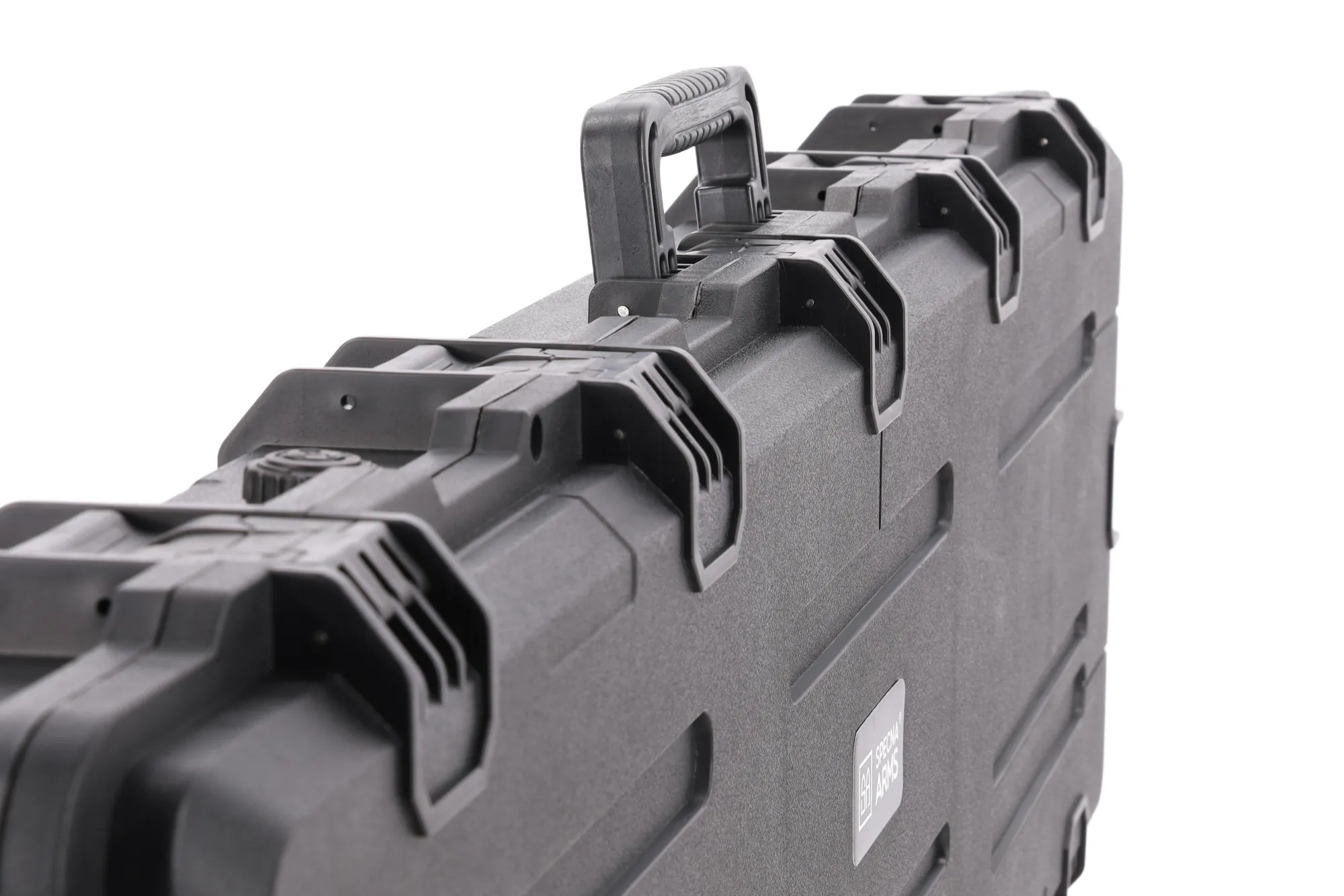 Walizka posiada wygodne chwyty transportowe (jeden do poziomego drugi do pionowego transportu) a front walizki jest ozdobiony logiem marki Specna Arms.