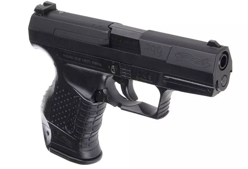 The P99 pistol replica is made mostly out of high-quality plastic. The plastic slide, after firing the last shot, locks in the rear position, like in the real firearm counterpart. It has grooves on the grip to improve the hand grip during reloading.
