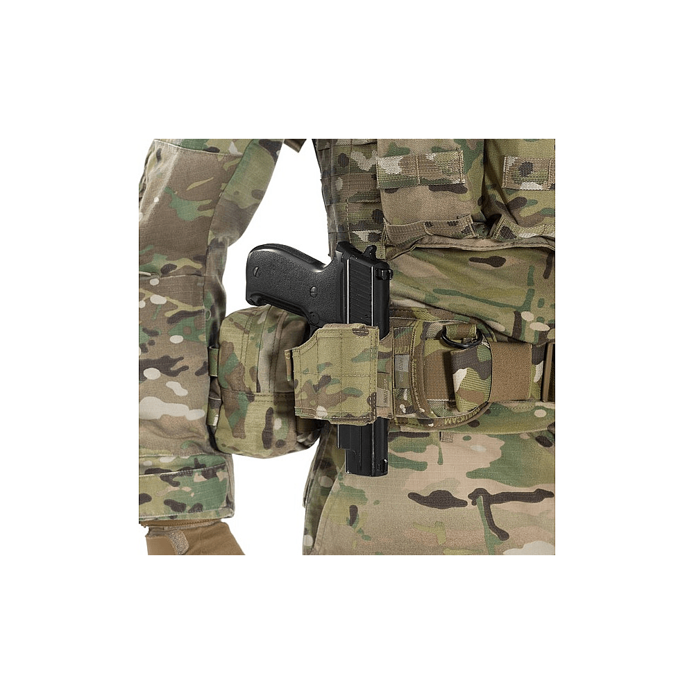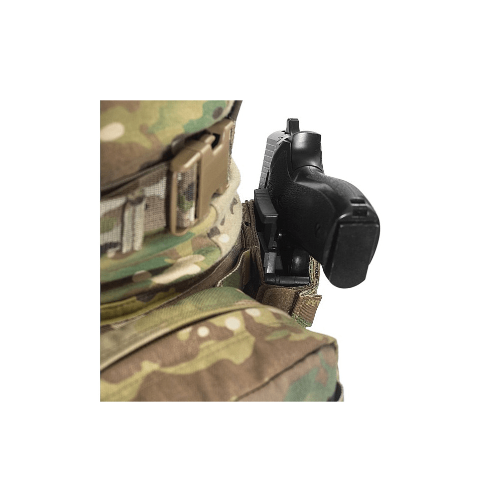 A lightweight, low-profile and extremely durable pistol holster designed to fit most duty and civilian handgun models. The inner composite shell keeps the weapon firmly in place while allowing quick and safe draw with a simple press of the internal release tab.The holster attaches via three rows of MOLLE and two straps, making it compatible with tactical belts, plate carriers, and chest rigs. The outer shell is water-resistant, features low infrared visibility, and is resistant to UV and mildew. Constructed with US-made Mil-Spec nylon thread, the build is rugged and reliable even in harsh conditions. A Velcro adjustment system allows custom fitting from a Glock 42 to a Desert Eagle.