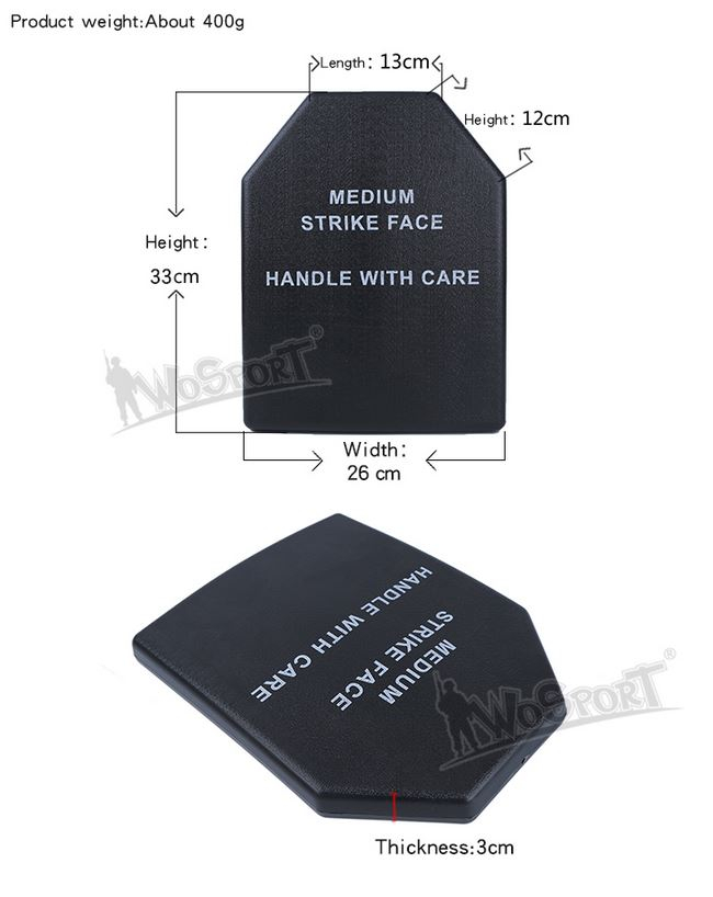 Very nice replica of the ballistic plate for bulletproof vests and plate carriers. The casing is hollow, made of plastic. Weighing 400 grams. Dimensions correspond to the size of the medium ballistic plates and is intended for insertion in the vest pocket.