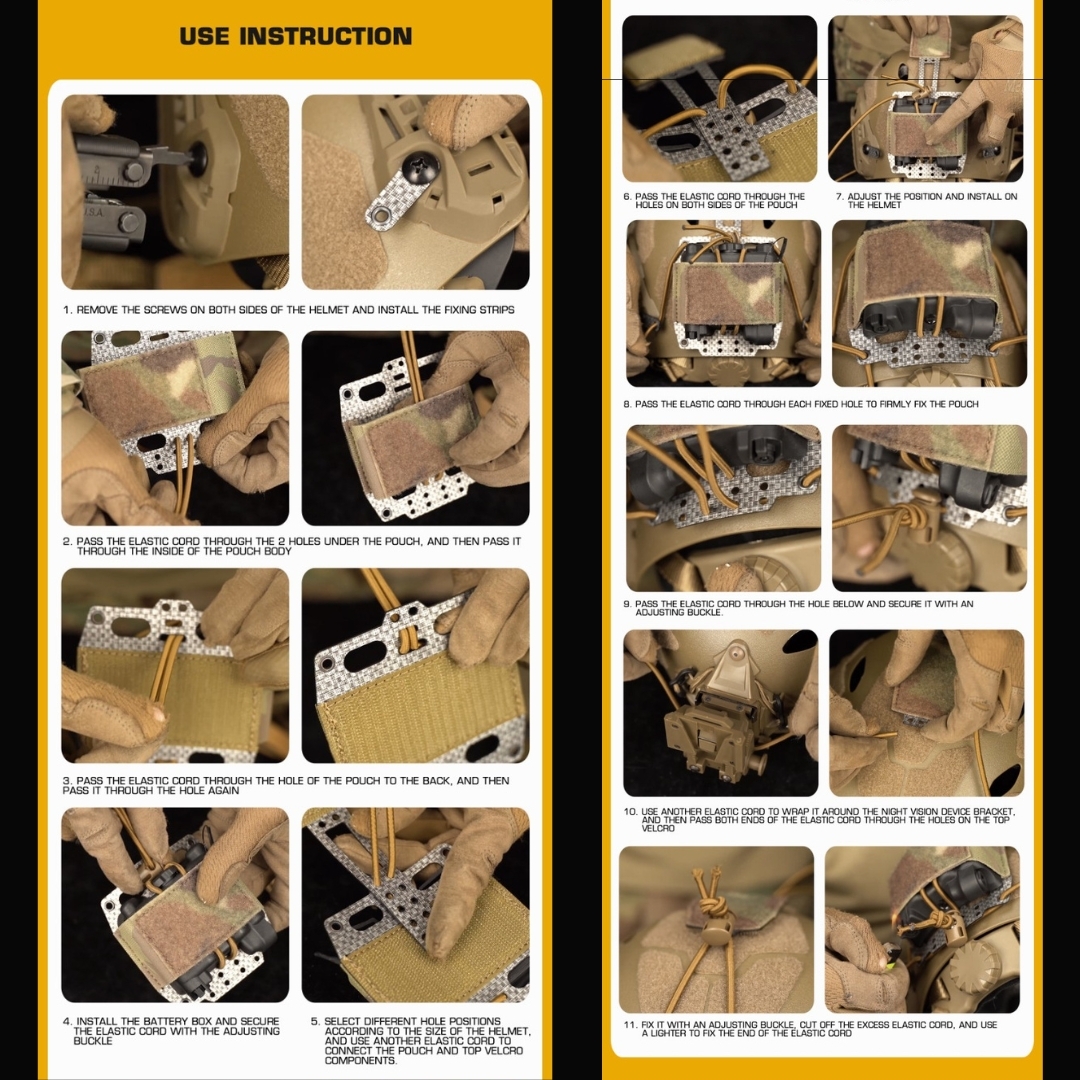 A universal helmet pouch for storing the NVG battery box PVS-31 (approx. 8.5 x 4 x 8.8 cm) or a power bank of similar dimensions, ensuring power supply for your NVG device or outdoor camera. The pouch has elastic edges, so it can accommodate slightly larger boxes. The base of the pouch is made from durable nylon, ensuring long-lasting durability and resistance to mechanical damage. The bottom and top parts are equipped with Velcro and holes for elastic straps (included). The mounting set also includes 2 side adapters for ARC rails on the helmet, providing a secure attachment without the risk of loss.