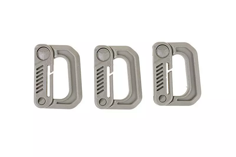 Zestaw trzech uniwersalnych klamer-karabinków o kształcie D-ringa, wykonanych z twardego tworzywa. Zamykany za pomocą prostego zatrzasku, posiada specjalne wycięcie umożliwiające montaż np. na palsach systemu modułowego MOLLE.