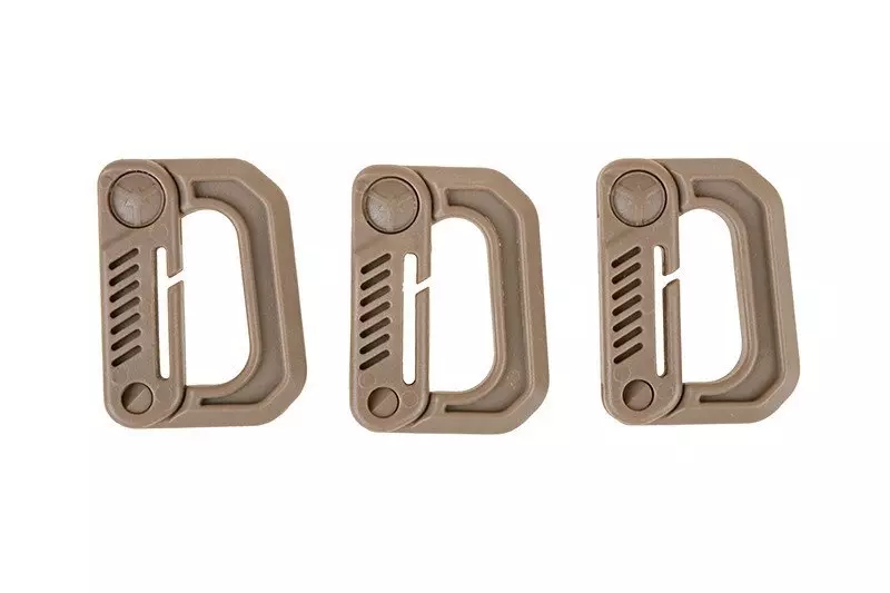 Zestaw trzech uniwersalnych klamer-karabinków o kształcie D-ringa, wykonanych z twardego tworzywa. Zamykany za pomocą prostego zatrzasku, posiada specjalne wycięcie umożliwiające montaż np. na palsach systemu modułowego MOLLE.