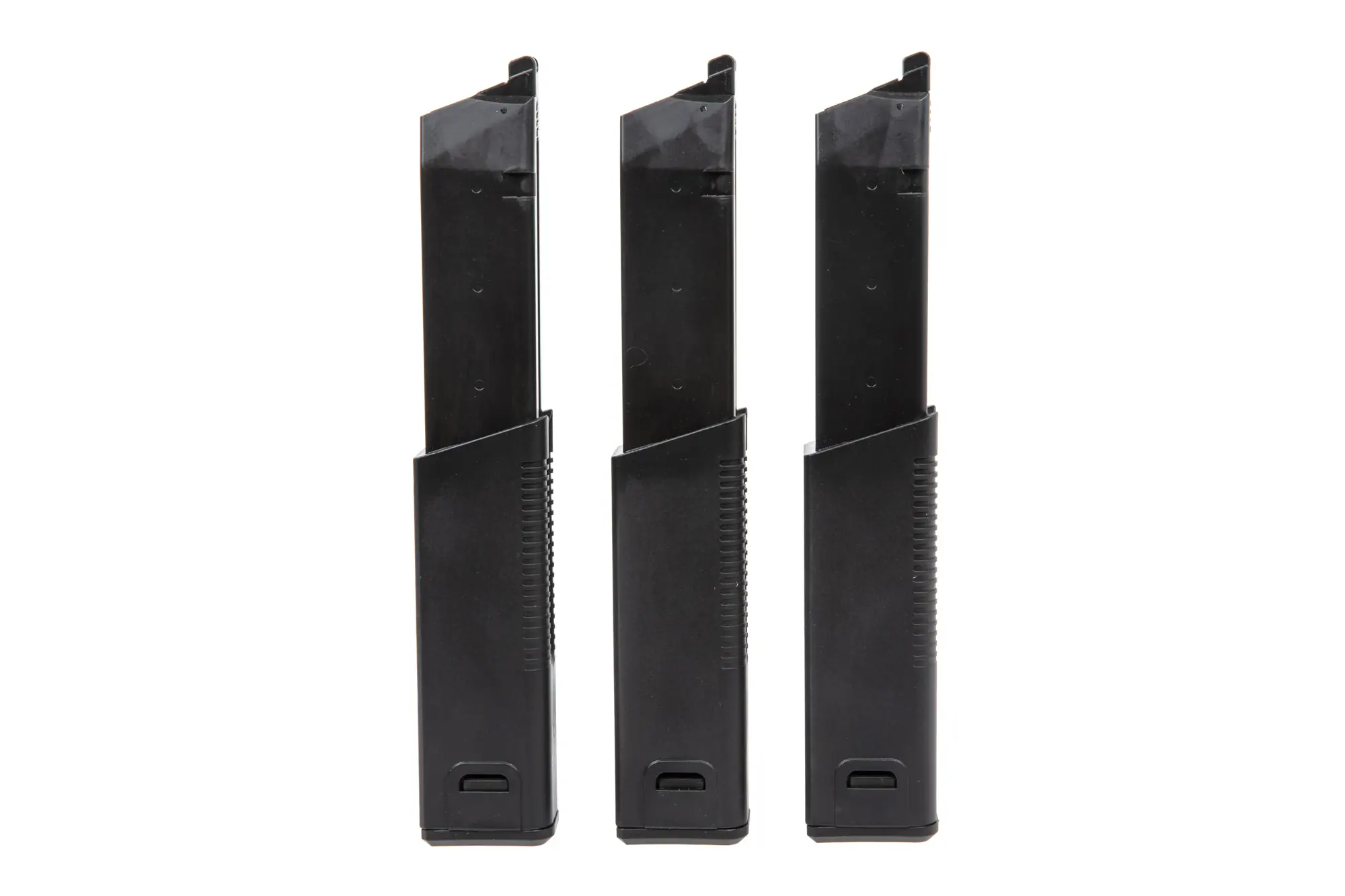 Magazynki zasilane są Green Gasem, mieszczą 60 kulek. Produkt posiada specjalne nacięcia na uchwycie – pozwoli to łatwiej wyciągać magazynki z repliki.