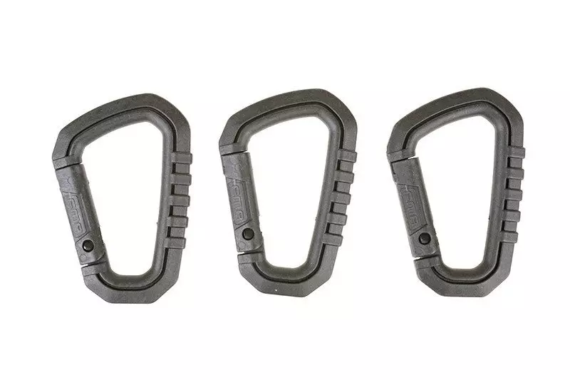 Zestaw trzech uniwersalnych karabinków wykonanych z wytrzymałego tworzywa. Zamykany za pomocą prostego zatrzasku. Świetne zastępstwo dla klasycznych, metalowych karabinków, oraz dobre uzupełnienie kamizelki taktycznej, plecaka, etc.