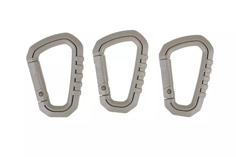 Zestaw trzech uniwersalnych karabinków wykonanych z wytrzymałego tworzywa. Zamykany za pomocą prostego zatrzasku. Świetne zastępstwo dla klasycznych, metalowych karabinków, oraz dobre uzupełnienie kamizelki taktycznej, plecaka, etc.