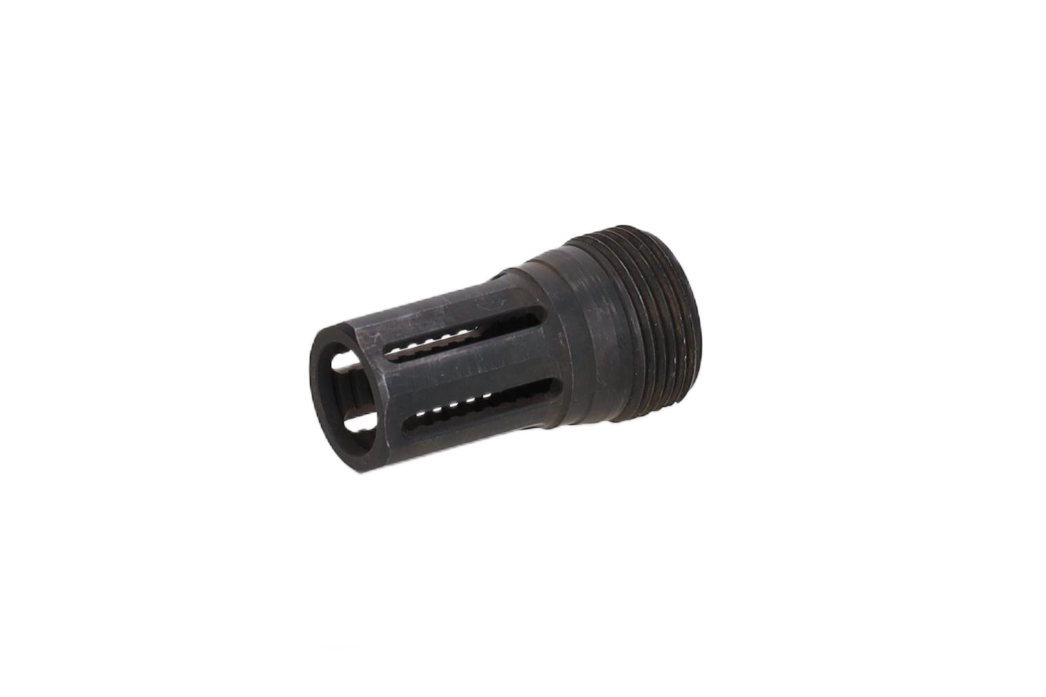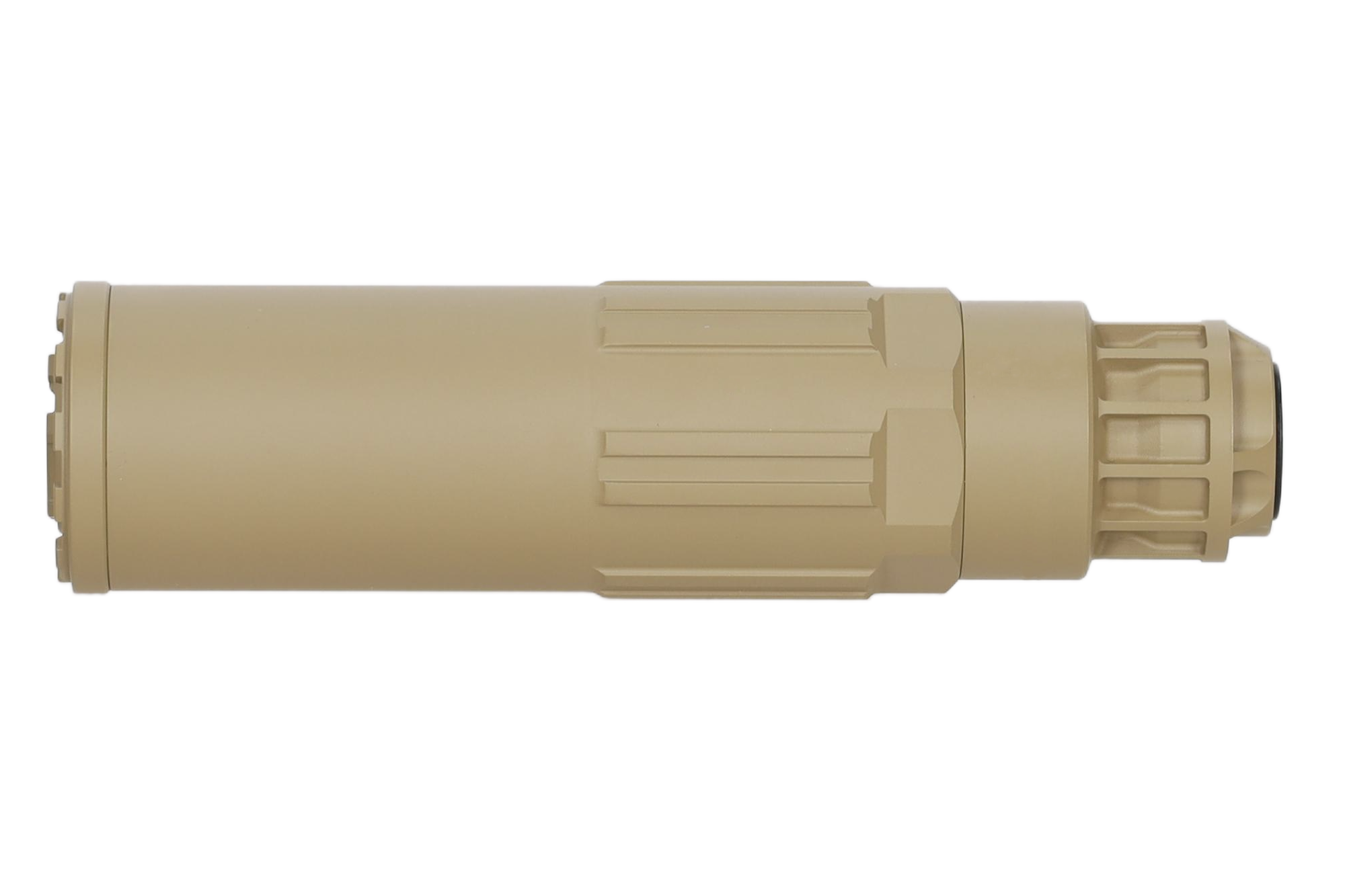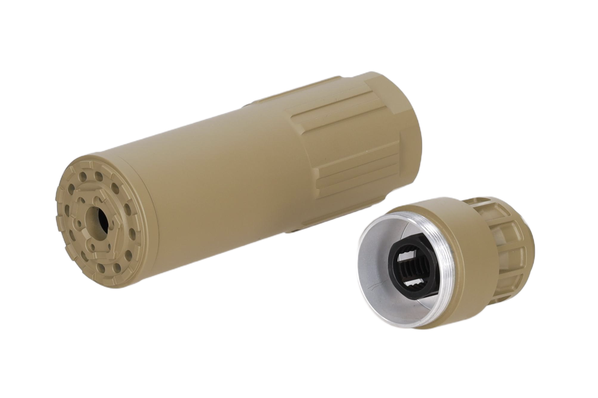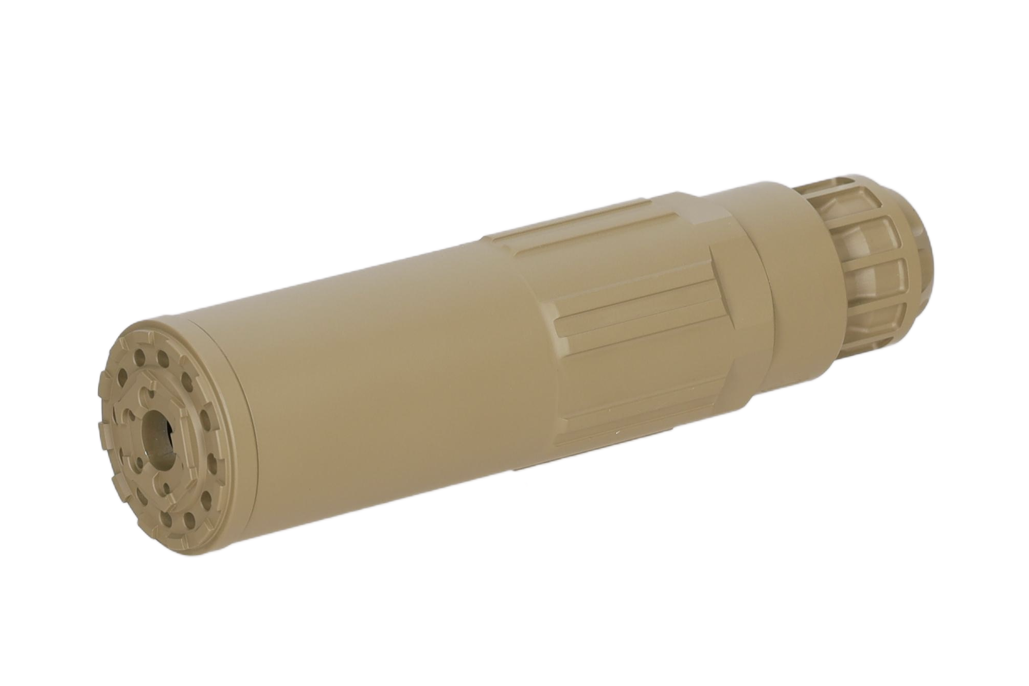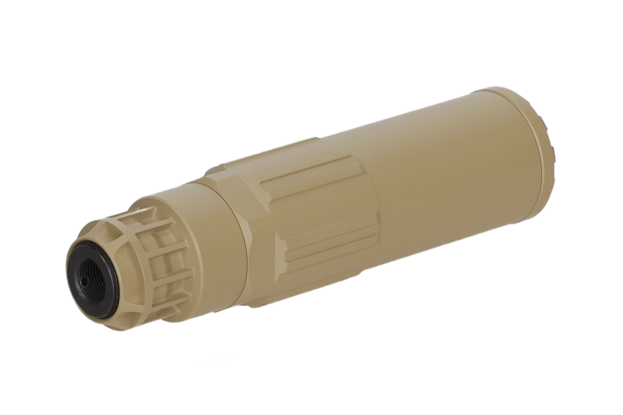 Tłumik dźwięku do replik ASG wykonany z aluminium. Wewnątrz znajdziemy stalowy tłumik płomienia z gwintem 14mm CCW (kompatybilność z wieloma replikami dostępnymi na rynku) oraz wewnętrzne gąbki.